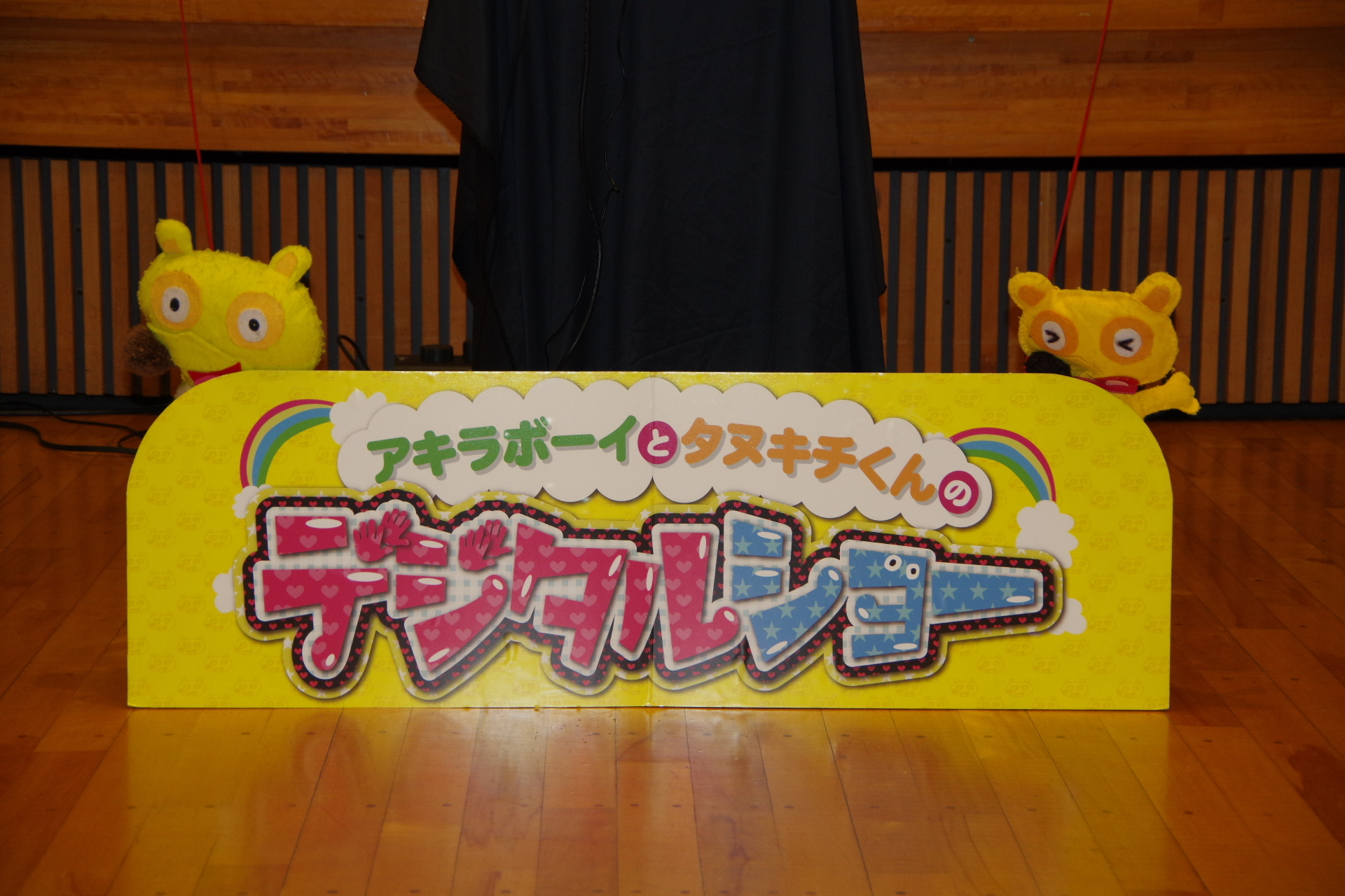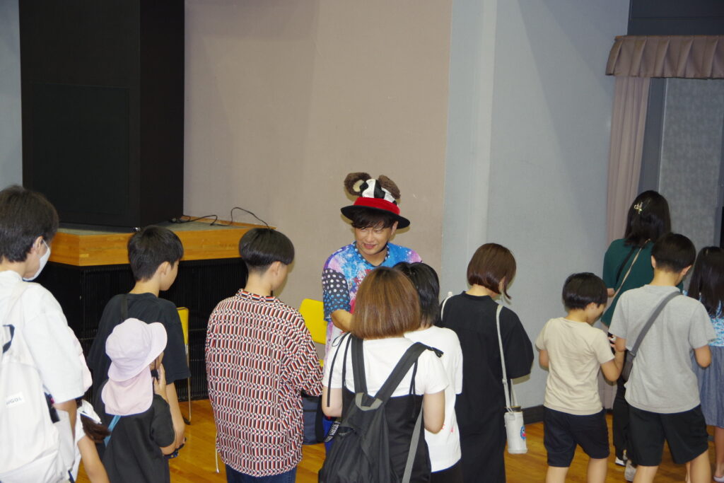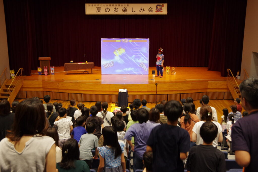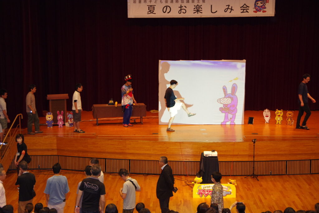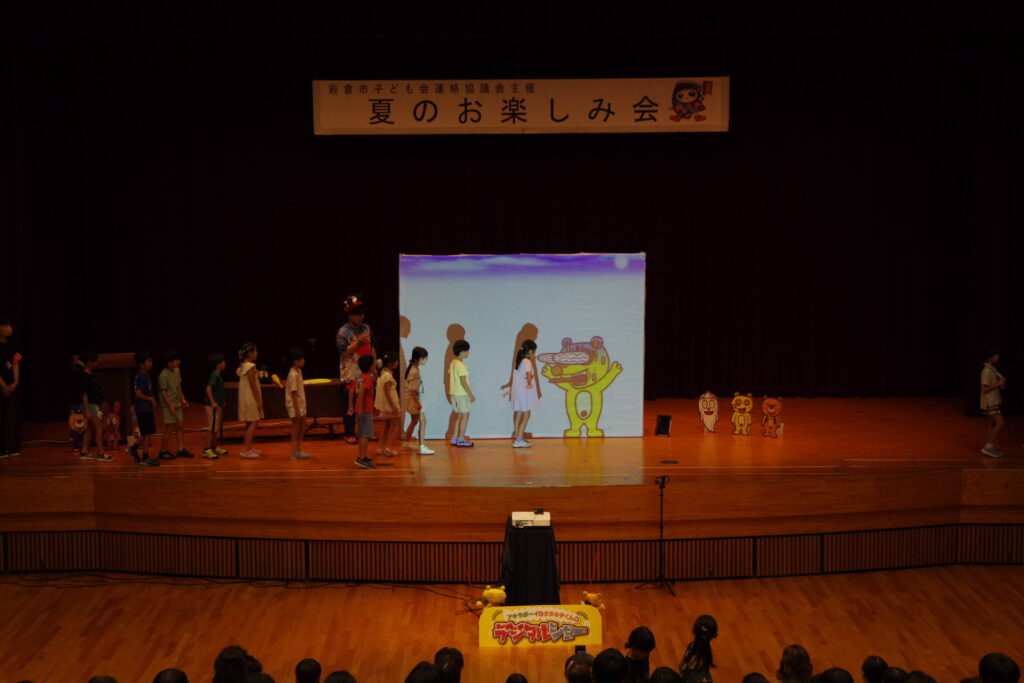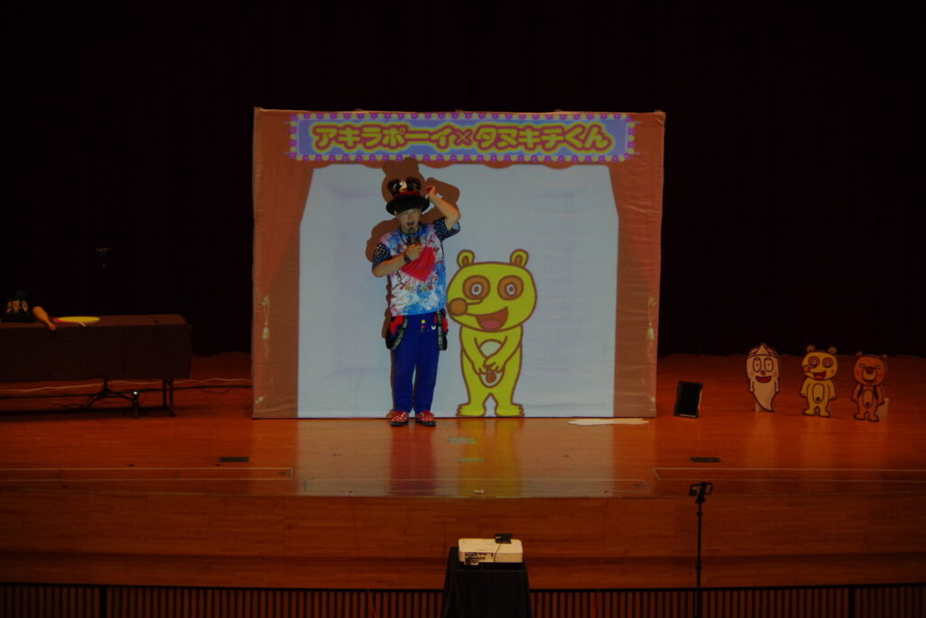 今回は、お笑い芸人アキラボーイさんによる「デジタルショー」を行いました。デジタルショーとは、‘’スクリーンの中のキャラクターと一緒に遊べる参加型のショー‘’のことです。