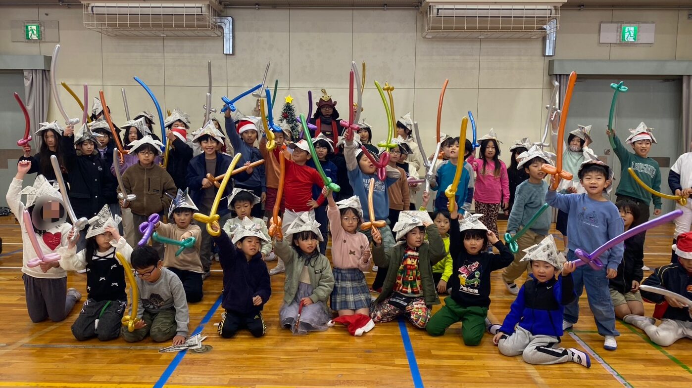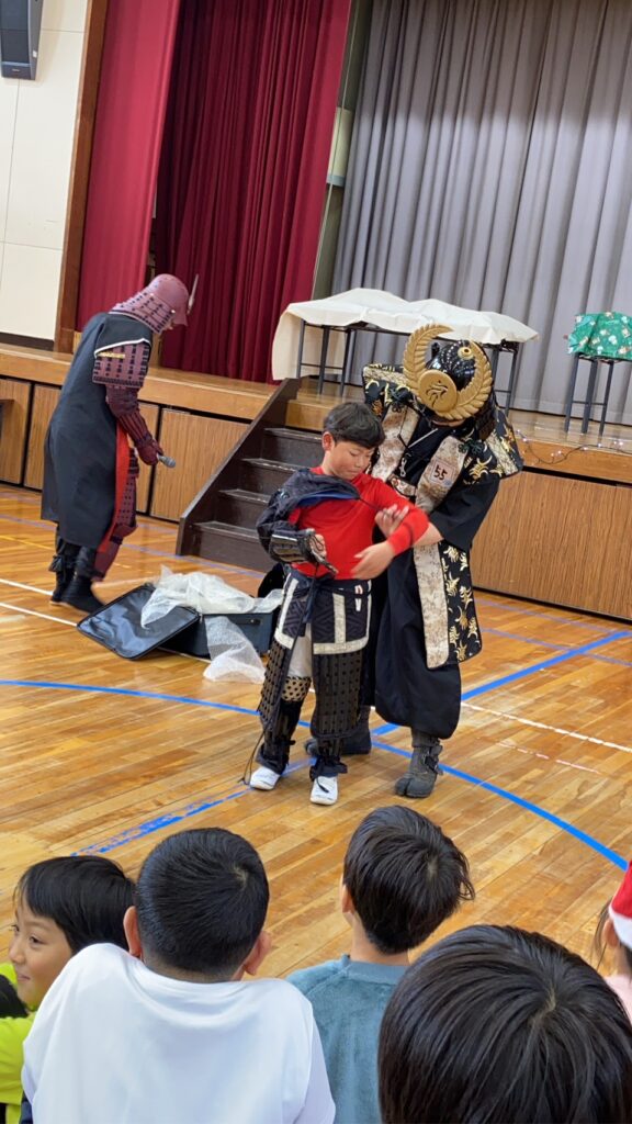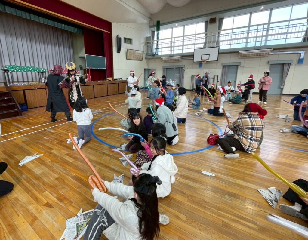 クリスマス会では、ボランティアサークル「岩倉武将隊」をお招きし、歴史と体験を通して学べる貴重な時間を提供することができました。ふれあい祭りでの一豊行列の神輿が入賞したことについて表彰状披露をしました。それにあわせて、岩倉武将隊さんから、岩倉城の歴史や、織田信長をはじめとする関連武将についてのお話を伺いました。子どもたちは、地元の歴史への理解を深める良い機会となりました。